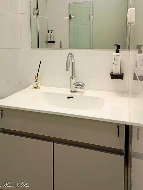חדר האמבטיה מאובזר. המקלחון חגיגה. אולי זה ישמע לכם טיפשי, אבל אותי, תמיד מעצבנים בקבוקי השמפו והסבון. מיניאטוריים או בגודל מלא – הם תמיד יהיו בעלי כושר תנועה והתחמקות, ותמיד ינצלו את העובדה שלעת חפיפה עיניי עצומות. בכל מלון בו ביקרנו הבקבוק זז, ולא אחת (בדרך כלל כשהוא בגודל מלא) גם רואה לנכון לצנוח ולפגוש את אצבעות רגלי בנחיתה לא רכה בכלל. ופה, ישבו ישיבת הקשב ללא תזוזה או דבר וויכוח. המקלחון נסגר בצורה מושלמת כך שטיפה לא זולגת ממנו החוצה. והמגבת שעל הרצפה מחכה יבשה וחייכנית (טוב, אז לא חייכנית) למדרך רגליכם. בחצר הנעימה ומסבירת הפנים שולחנות קטנים.